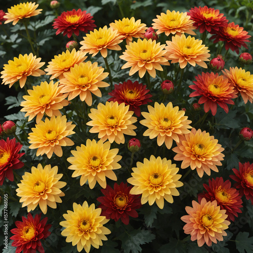 Colorful yellow and red chrysanthemums blooming in garden