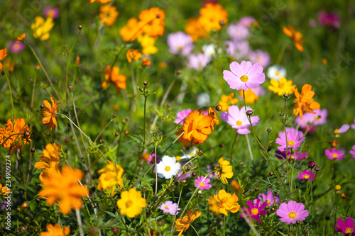 Colourful Cosmos flowers are blooming in the field when Autumn season is coming. It is very beautiful when blossom in the field.