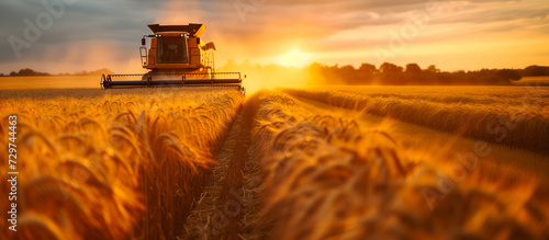 Combine harvester at work in a golden wheat field during sunset, depicting modern agriculture and harvest season, background with a place for text