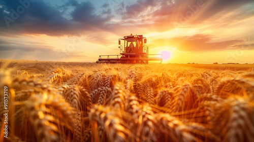 Combine harvester working in wheat field at sunset. Ripe wheat harvest. Agriculture and farming.