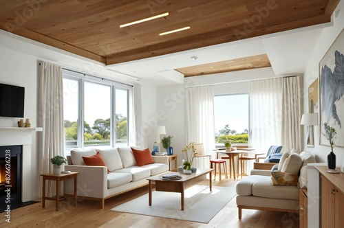 Comfortable and stylish modern living room with a white sofa, wooden ceiling, and ample natural light from large windows