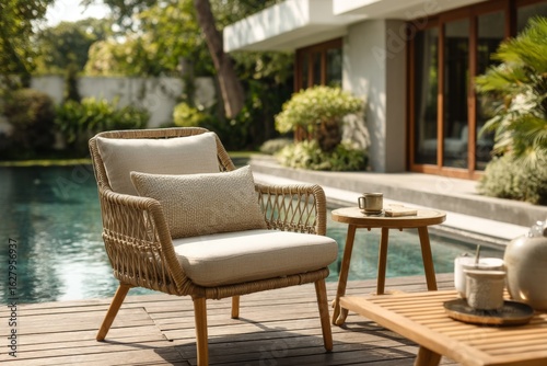 Comfortable outdoor seating area with a pool in a sunny garden setting