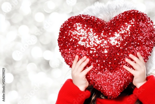 Commercial promotion conceptual art. Sign of love. Сhildren valentine's day greeting card: child girl with begging eyes face holds red heart in hands. Family holiday ad. Child hugging heart.