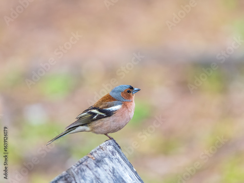 Common chaffinch, Fringilla coelebs, sits on a tree. Common chaffinch in wildlife.