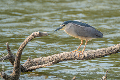 Common Martinete, Nycticorax nycticorax, perched on a branch waiting to fish on the waters of the river