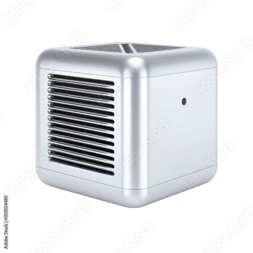 air, cooler, purifier, humidifier, cube, silver, metallic, modern, device, technology, appliance, cooling, clean, ventilation, contraption, portable, desktop, small, compact, home, office, climate, control, personal, fresh, breeze, sleek, design, minimalist, square, rounded, corner, louver, wind, grill, white, grey, isolated, background, black, nobody, object, machinery, electric, refreshing, environment, comfort, domestic