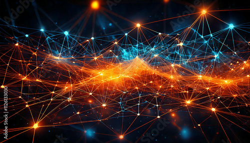 abstract background, network, connection, technology, digital, abstract, pattern, design, futuristic, innovation, communication, blue, orange, glowing, vibrant, neon, dot, line, node, web, mesh, grid, connectivity, complexity, datum, information, cyberspace, global, universe, galaxy, science, artificial intelligence