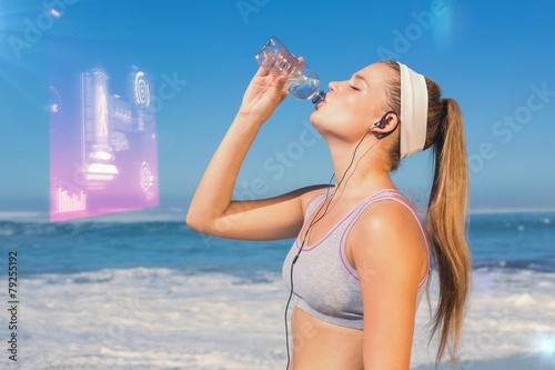 young adult, woman, female, caucasian, coastline, shore, summer, holiday, beach, sand, ocean, sea, water, sunshine, sunny, blue skies, vacation, fit, toned, healthy, fitness, health, physical, shape, activewear, sporty, athletic, slim, slender, purple, body, wellness, bodycare, exercise, training, working out, pretty, attractive, beautiful, sports bra, holding, bottle, hydratation, drinking, listening, music, earphones, digital