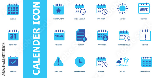 Comprehensive monthly calendar icon set for business planning and schedule management; minimalist flat vector design perfect for web UI, app interfaces, and planners.