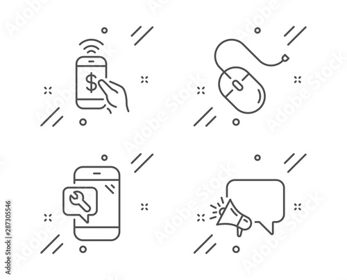 Computer mouse, Phone payment and Phone repair line icons set. Megaphone sign. Pc device, Mobile pay, Spanner service. Brand message. Technology set. Line computer mouse outline icon. Vector