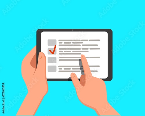 Computer tablet with checklist on screen. Online form survey, tablet with showing long quiz exam paper sheet document, online questionnaire results.