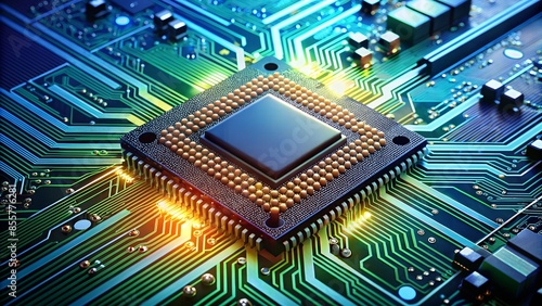Computing processor, central processing unit (CPU), microchips, and electronic circuit board. Conceptual background of advanced technology.