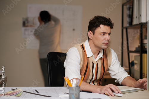 Concentrated architect working on computer when his colleague putting blueprint on wall in backg