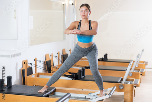 Concentrated young girl practicing exercises on Pilates reformer. Concept of pilates as physical therapy alternative for injury rehab
