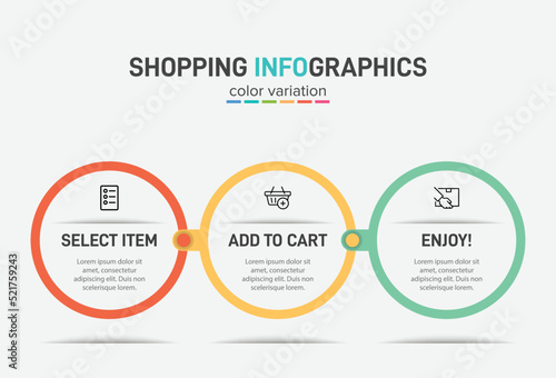 Concept of shopping process with 3 successive steps. Three colorful graphic elements. Timeline design for brochure, presentation, web site. Infographic design layout.