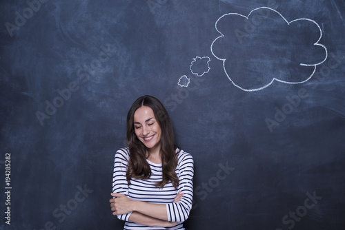 Concept of thought. Young smiling beautiful woman standing at the blackboard in casual clothes