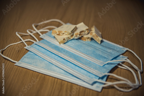 sweet, sugar, honey, almond, nougat, delicious, pistachio, cookery, confection, typical, tradition, cube, winter, italy, wood, hard, box, greed, piece, traditional, nut, delight, macro, tasty, closeup, italian, hazelnut, holiday, snack, spanish, epicure, stacker, candy, bar, food, festive, north, conceptual, corona, virus, mask, pandemic, 2021, christmas