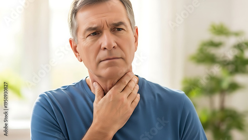 Concerned Older Man Touching Throat in Bright Room, Health Awareness, Lifestyle Photograph, Natural Light