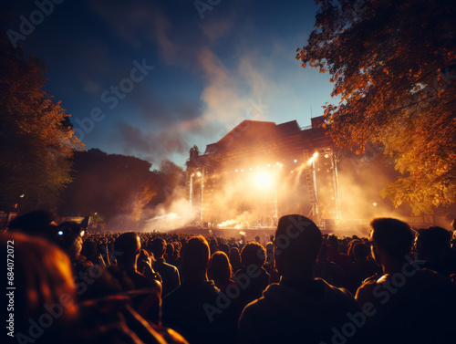 concert, crowd, music, background, people, party, happy, fun, festive, lifestyle, dance, live, entertainment, night, orange, blue, dusk, enjoyment, festival, atmosphere, autumn, stage, light, beam, audience, celebration, event, culture, silhouette, evening, group, social, performance, vibe, sound, musical, energy, togetherness, excitement, mood, twilight, harmony, enthusiasm, ai, generative, illustration