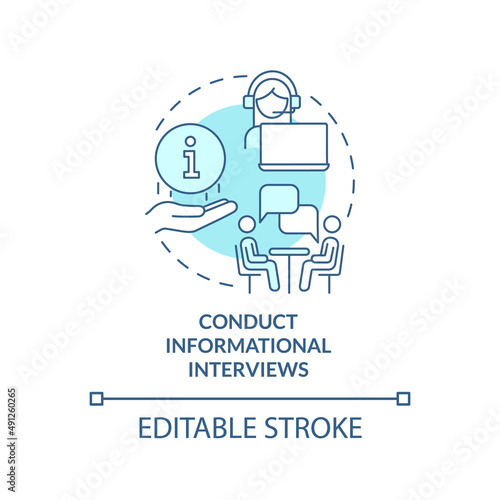 Conduct informational interviews turquoise concept icon. Step to choose career abstract idea thin line illustration. Isolated outline drawing. Editable stroke. Arial, Myriad Pro-Bold fonts used