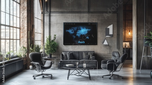 Conference room with a digital touch table, real-time analytics display, and a modern collaborative work environment.