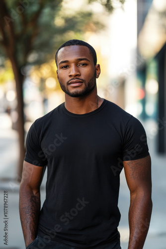 Confident African American man in untucked black t-shirt standing on a sunlit city street in the daytime