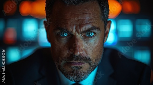 man, portrait, businessman, executive, remote, video, conference, call, screen, lighting, leadership, clarity, confident, business, professional, technology, communication, digital, indoor, studio, closeup, serious, focused, thoughtful, pensive, contemplative, corporate, office, work, head shot, adult, male, dark, intense, intelligent, authority, boss, ceo, manager, entrepreneur, suit, attaching, beard, blue, eye