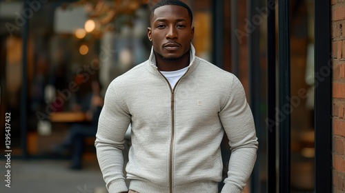 black man, african american, male model, portrait, urban, city, street, confident, stylish, fashion, clothing, apparel, beige, knitwear, sweater, jacket, cardigan, casual clothes, menswear, daytime, model, photogenic, attractive, sophisticated, elegant, modern, contemporary, pose, standing, calm, serious, expression, expressionless, texture, fabric, detail