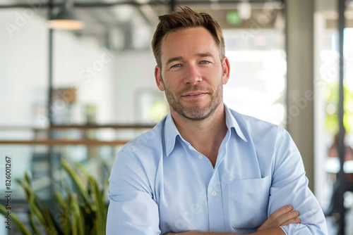 business, professional, office, leader, success, confident, man, portrait, modern, corporate, executive, entrepreneur, person, people, indoor, workspace, photogenic, smile, smiling, casual attire, shirt, arm, crossed, looking, camera, young, male, men at work, happy, achievement, satisfaction, manager, formal, occupation, job, ambitious, boss, employee, stylish, man, workplace, serious, chief, development, businessman