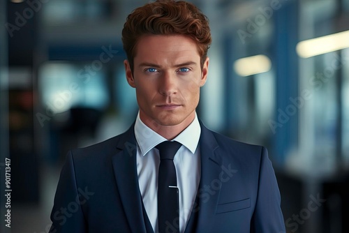 Confident businessman in a suit, embodying professionalism and success in a modern corporate environment.