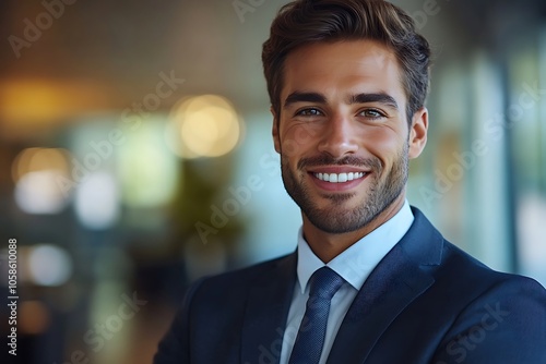 Confident Businessman in Blue Suit Smiling in Office Setting5