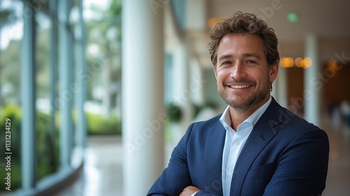 businessman, confident, modern, office, smiling, professional, success, executive, leader, indoor, suit, arm, folded, bright, cheerful, corporate, glasses, window, hallway, natural, light, workspace, formal, blue, jacket, beard, curly, hair, male, adult, photogenic, casual attire, expression, friendly, happy, optimism, smart, business, entrepreneur, mentor, adviser, meeting, workplace, inspiration, ambition, motivation, relaxed