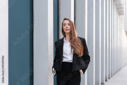 Confident businesswoman in black suit walking along building. Young woman with long hair looking away in city, exuding professionalism and elegance in an urban environment