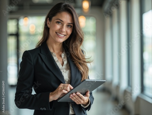 Confident Businesswoman Using Tablet in Modern Office Hallway – Professional Corporate Portrait