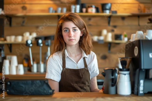 standing, apron, business, entrepreneur, occupation, owner, cafes, portrait, smiling, success, service, small business, confident, happy, horizontal, manager, one person, waitress, caucasian, color image, confidence, counter, female, happiness, looking, photo, eatery, store, woman, work, working, aspiration, checkout, copy space, employee, front view, indoor, job, person, shop, staff, young, young adult, businesswoman, pride, professional, retail, successful