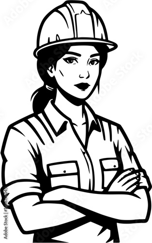 woman, female, construction, men at work, engineer, builder, hard hat, helmet, safety, professional, confident, arms crossed, logotype, design, graphic, illustration, black, white, monochrome, silhouette, strong, empowered, industry, building, architecture, project, skilled, expert, construction worker, labor, job, career, occupation, trade, construction site, development, building site, contractor, foreman, supervisor, manager, leadership, authority, expertise, cognition, skill, strength, determination