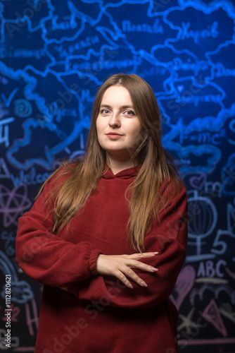 Confident female teacher standing in front of a chalkboard with a map. Perfect for themes of education, teaching, knowledge sharing, and school environment