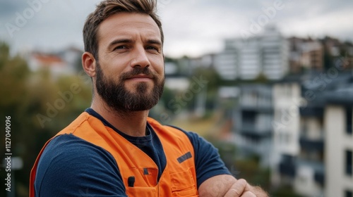 Confident male construction worker in bright vest standing outdoors against urban landscape background