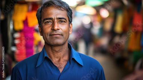 man, market, portrait, blue shirt, clothing, seller, adult, casual attire, ethnicity, background, culture, expression, sharpened, lifestyle, daytime, friendly, candid, personality, detail, looking, shop, people, vibrant, colours, street, commerce, confident, community, interaction, face, male, urban, smiling, attire, natural light, young adult, warm, cheerful, environment, photograph, realism, activity