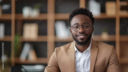 man, suit, office, professional, smiling, modern, brown, businessman, leadership, manager, co-worker, person, male, confident, guy, success, smart, company, goggles, business, portrait, casual attire, workspace, shelf, book, indoor, happy, young, afro, african, stylish, friendly, attire, corporate, relaxed, looking, cheerful, elegant, trendy, light, background, career, successful, attractive, photogenic, positive, engaged, seated, adult