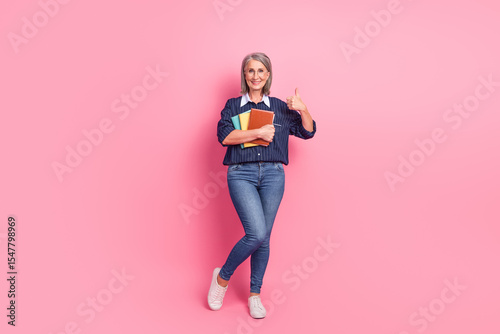 Confident mature woman with book gives thumbs up gesture in a stylish outfit against a vibrant pink background