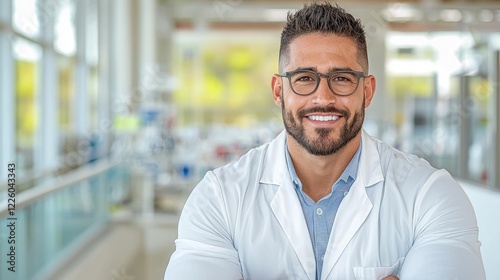 Confident scientist smiling in lab; research background