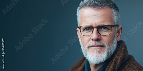 Confident Senior Man with Glasses and Beard in Cozy Sweater, Portrait Against a Soft Background