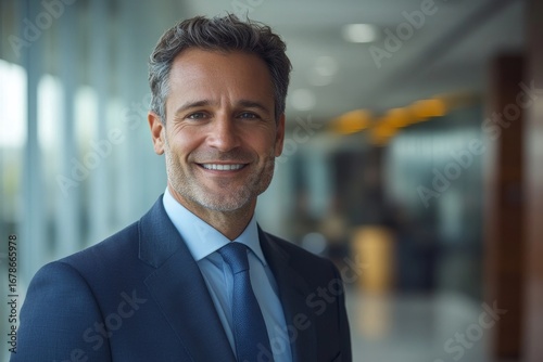 Confident smiling businessman in office setting portrait, reflecting success and competence in his professional environment, Generative AI