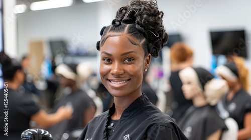 Confident Stylist: A young black woman with a bright smile and a confident look, showcasing her stylish bun hairstyle, working on a hairstyle in a busy salon setting.