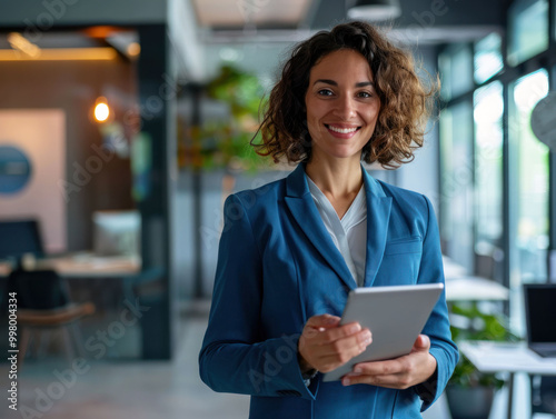 confident woman in blue suit holds tablet, smiling warmly in modern office environment. bright space features greenery and contemporary decor, creating inviting atmosphere