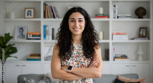 female, woman, smile, smiling, happy, design, bright, casual attire, portrait, friendly, beautiful, individual, content, confidence, curly hair, home, office, living room, businesswoman, professional, indoor, shelf, book, decor, organised, chic, self-esteem, stylish, positive, minimalism, feminine, arms crossed, light, home office, interior, workspace, bookcase, natural, attractive, adult, vibrant, inspiration