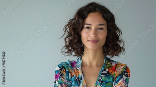 woman, portrait, curly hair, brown hair, floral pattern, natural beauty, confident, smile, positive, friendly, beautiful, fashion, model, style, hair, coiffure, closeup, studio, lifestyle, natural, gorgeous, attractive, make-up, casual attire, feminine, pretty, happy, joy, bright, elegant, missy, youthful, beautiful woman, soft focus, studio photography, natural light, artistic, creative, inspiration, confidence