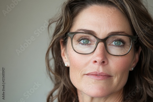 Confident woman with glasses looking at the camera in a softly lit indoor setting during the daytime