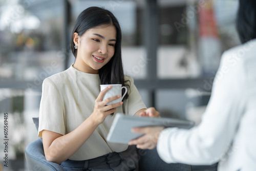 Confident young asian woman holding cup of coffee for relaxing drink while learning business online via tablet with successful finance and management professional at office.